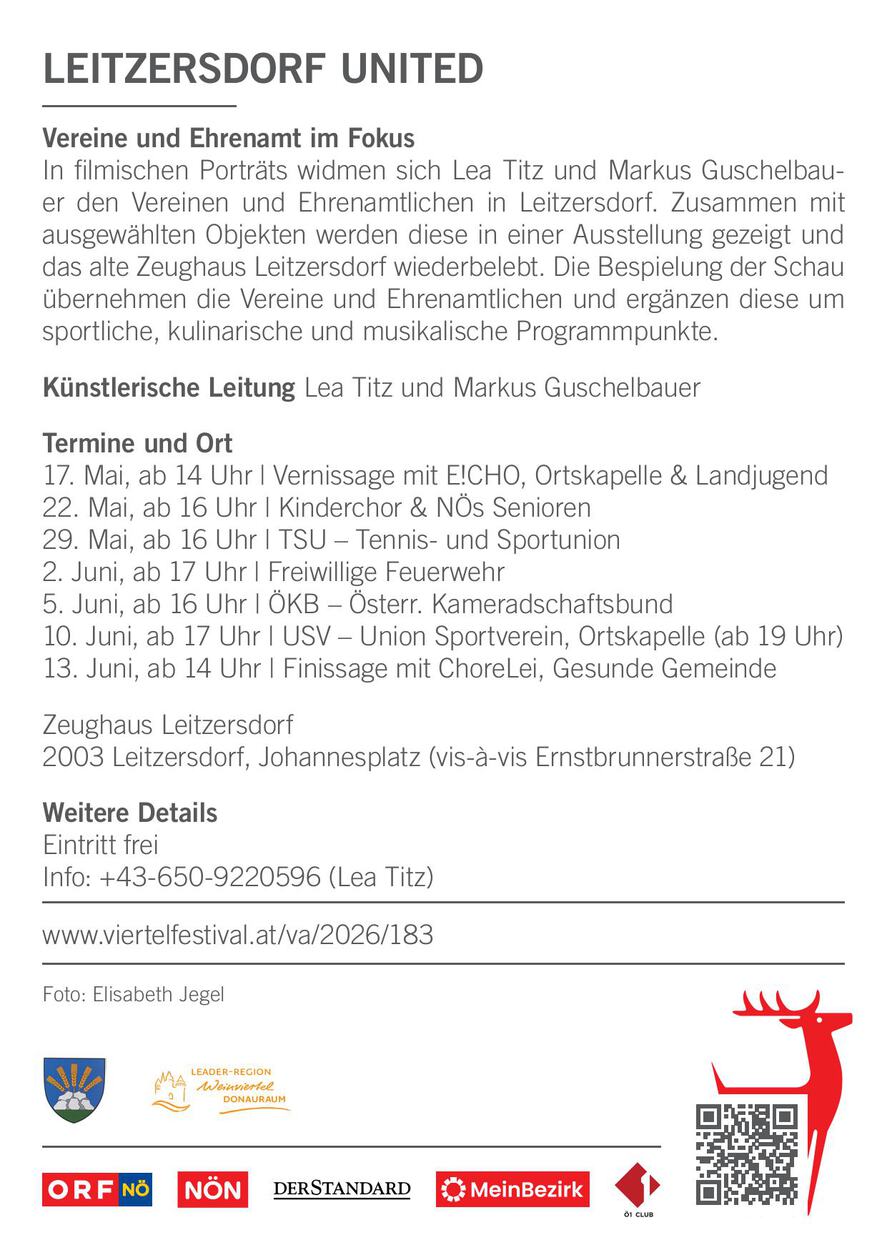 In Leitzersdorf ist wieder einiges los! Ab dem 17. Mai 2026 startet das Wein4telfestival – und wir von der Tennis- und Sportunion Leitzersdorf sind am 29. Mai beim Projekt „Leitzersdorf United“ mit dabei! Freut euch auf spannende filmische Einblicke in unsere Vereine und das Engagement der vielen Ehrenamtlichen. Gemeinsam mit tollen Ausstellungsstücken wird das alte Zeughaus wieder zum Leben erweckt.